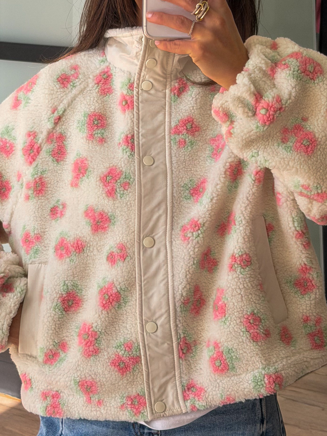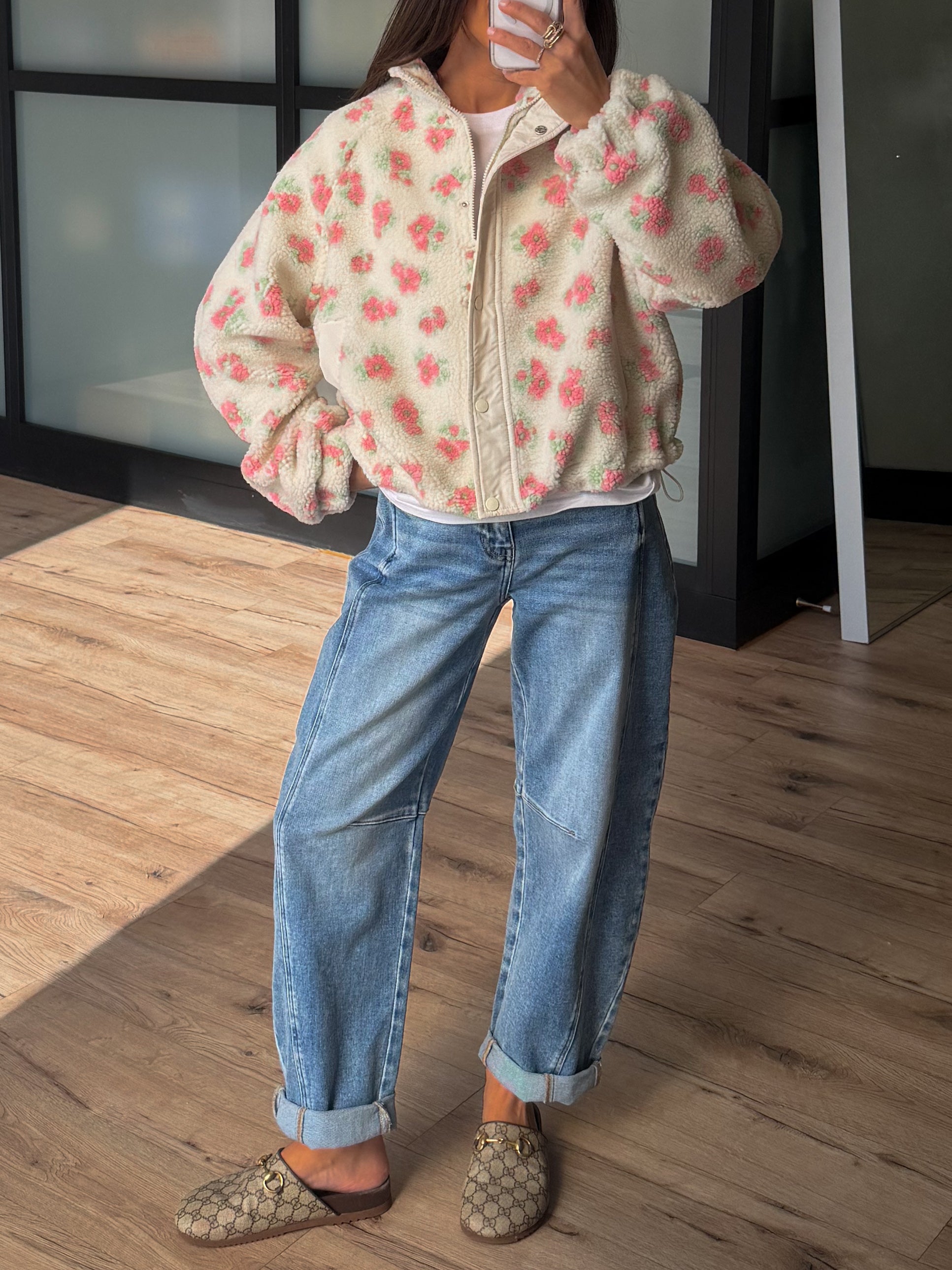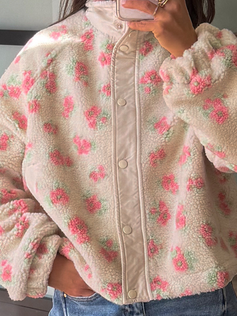 • Flower Pattern Faux Sherpa Bomber Jacket