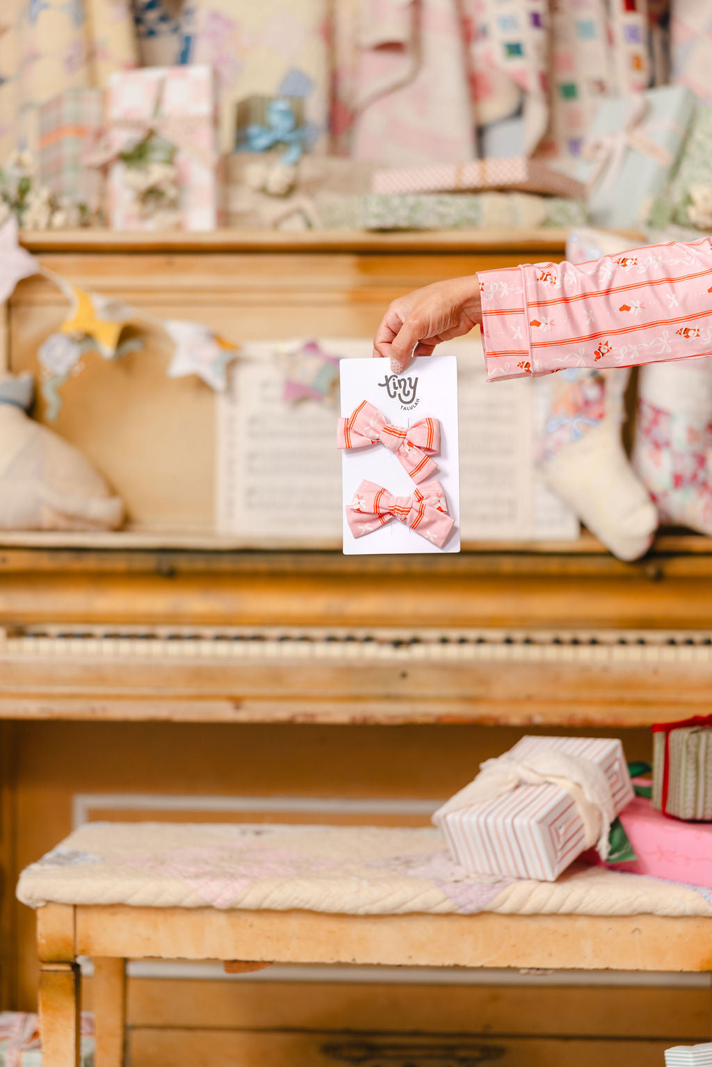Pink, Red Stripe, White Ribbon with Playful Santas and Stockings Print