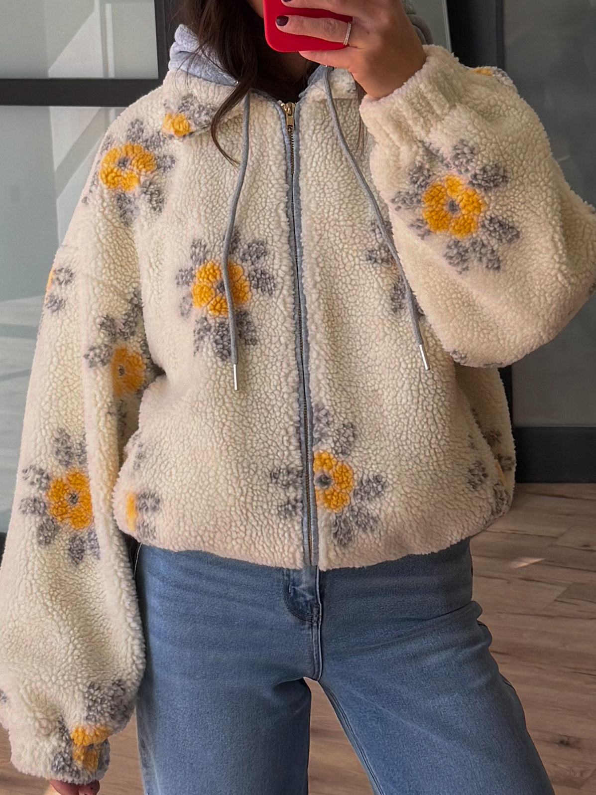 - Floral Print Sherpa Bomber Jacket with Contrast Hood