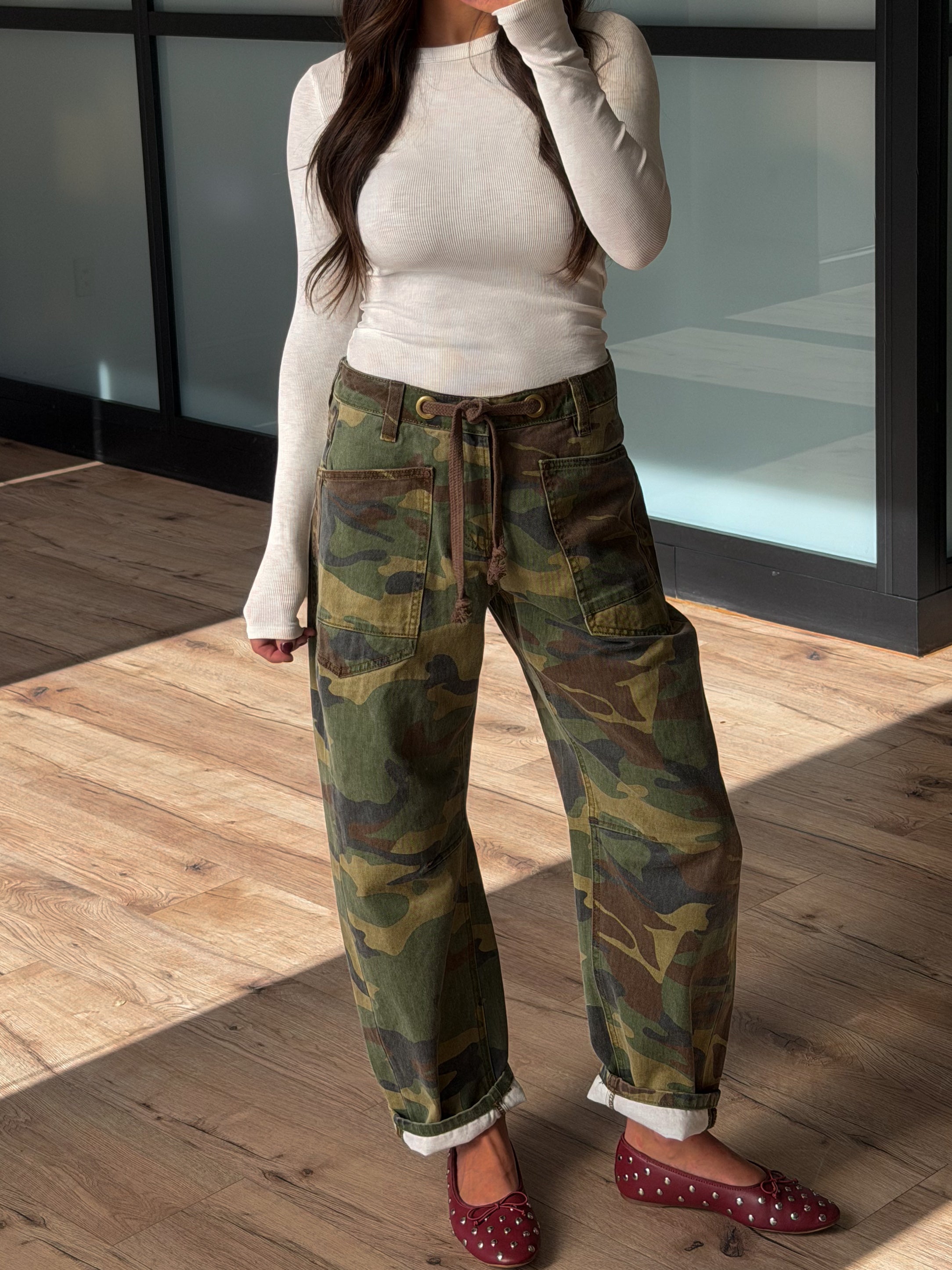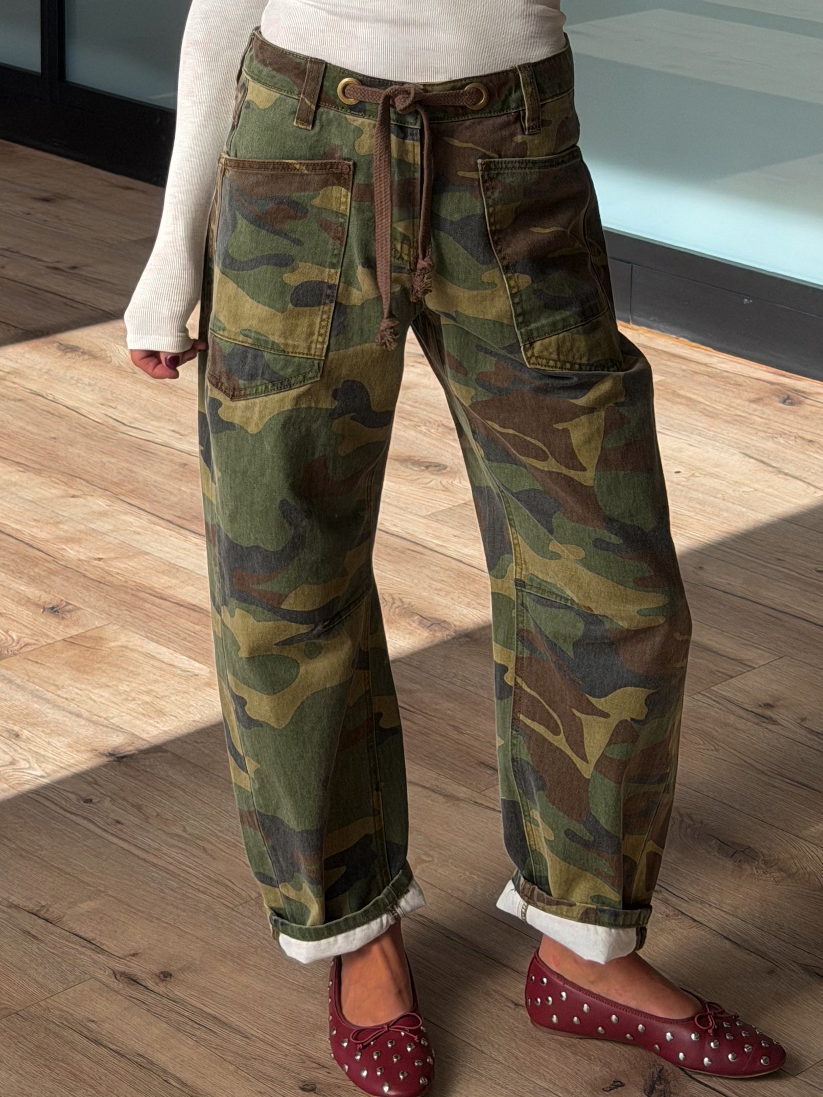 - Drawstring Tie, Camo Print Barrel Jeans