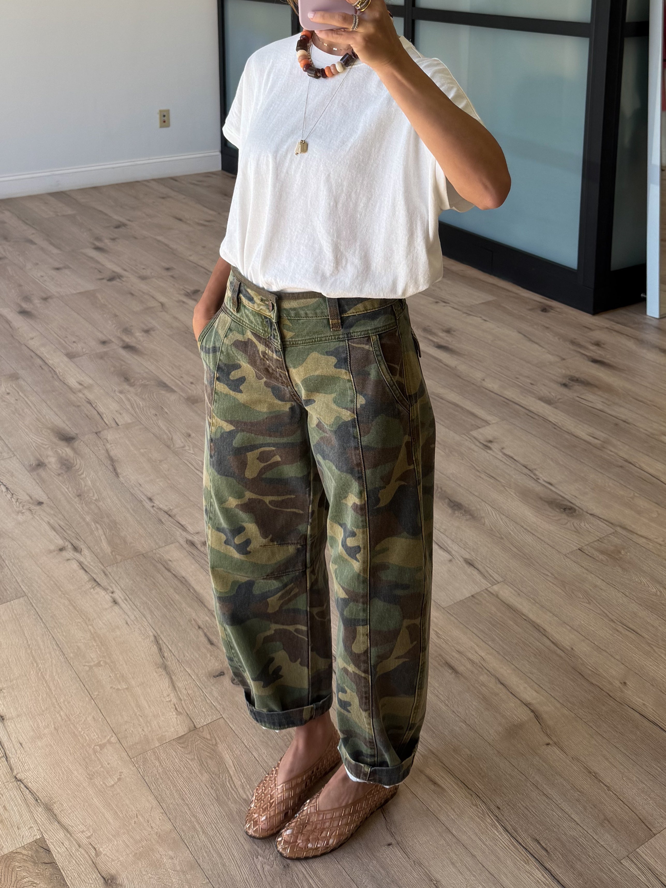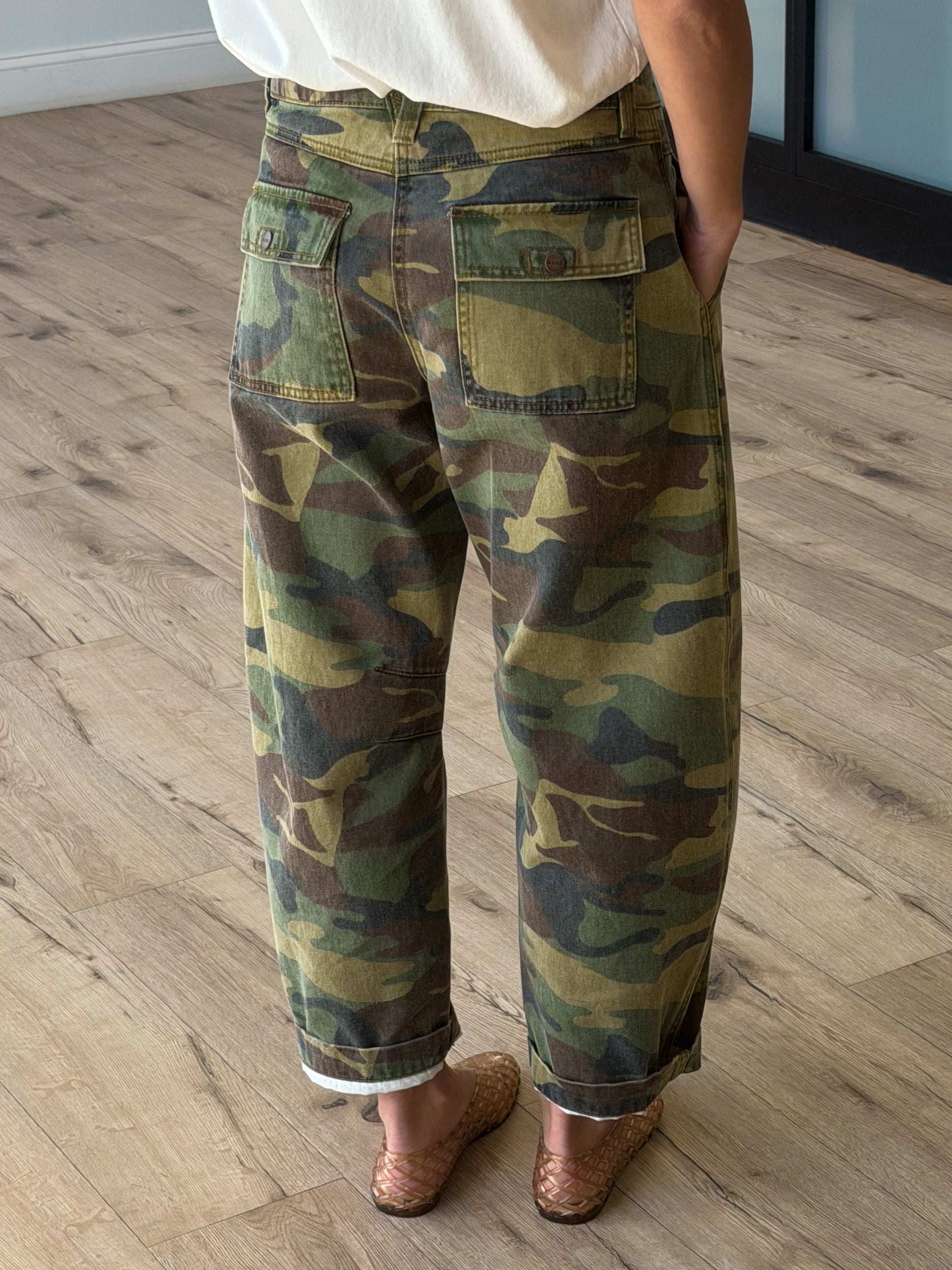- Mid-Rise Camo Print Barrel Jeans