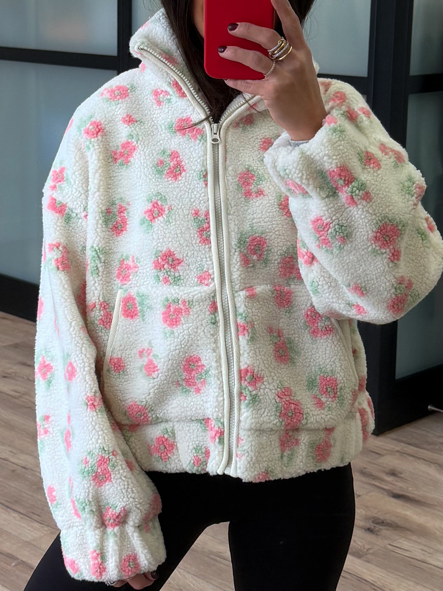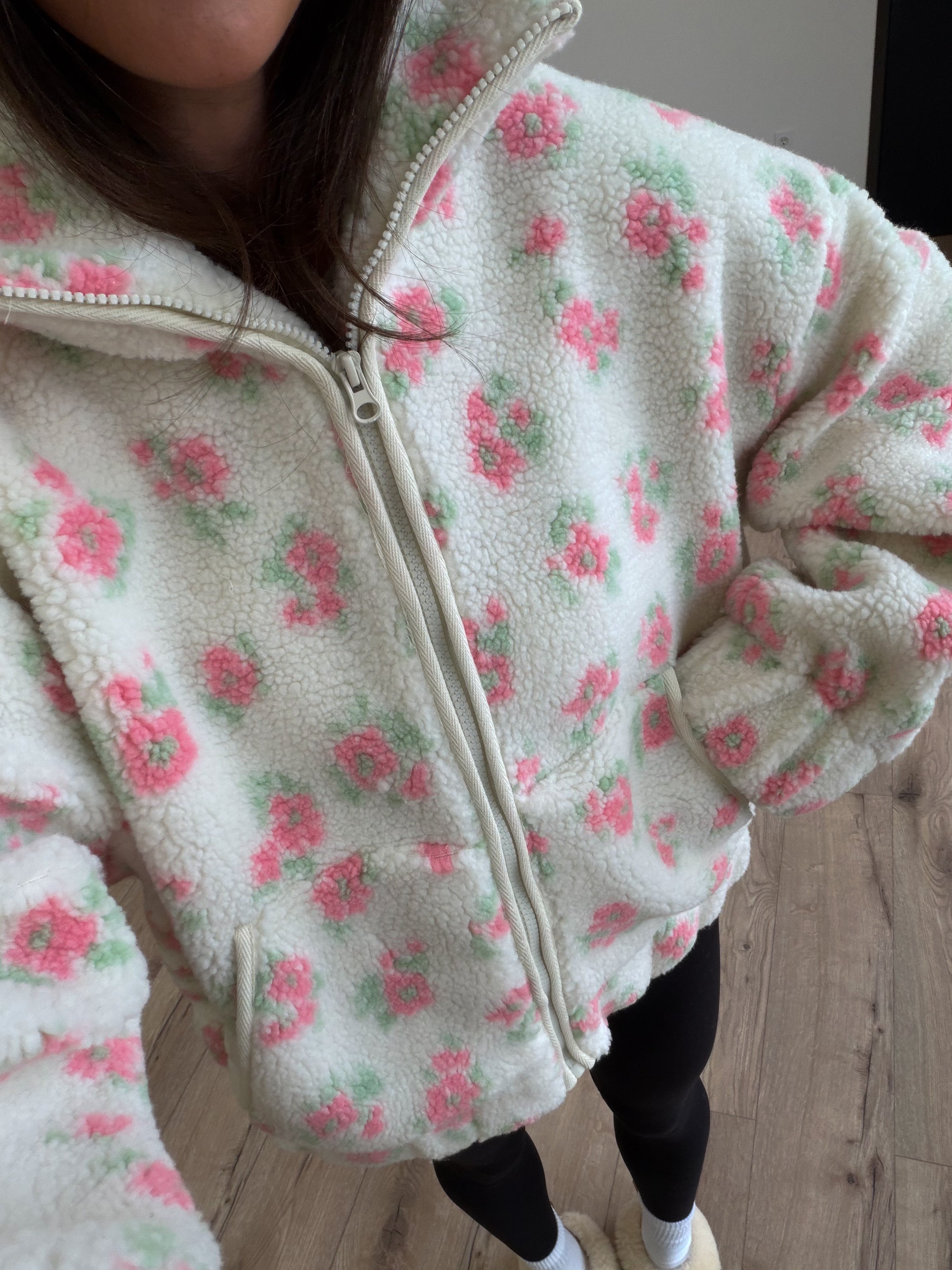 - Flower Pattern Faux Sherpa Bomber Jacket